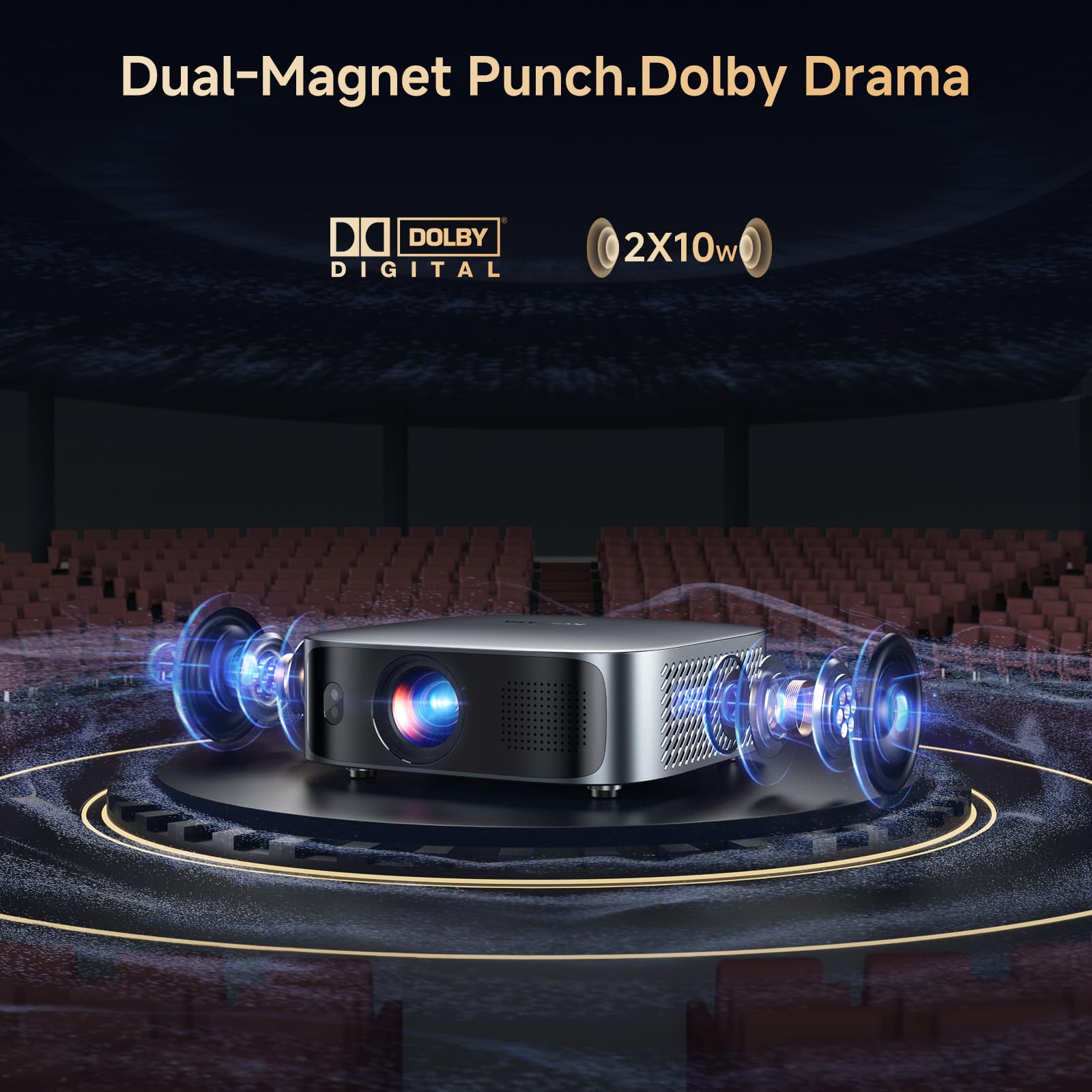 - 【Immersive Dolby Audio & Wireless Freedom】Experience rich, theater-quality sound with Dolby Audio and dual 10W speakers. This projector fills any room with stunning clarity, from deep bass to crisp highs. Stream wirelessly via dual-band WiFi or connect devices through Bluetooth 5.3. Pair wireless headphones for private listening or link external speakers for powerful sound. With easy screen mirroring, share videos, games, and apps directly from your phone. Perfect for films, sports, and gaming, it delivers both stunning visuals and immersive audio