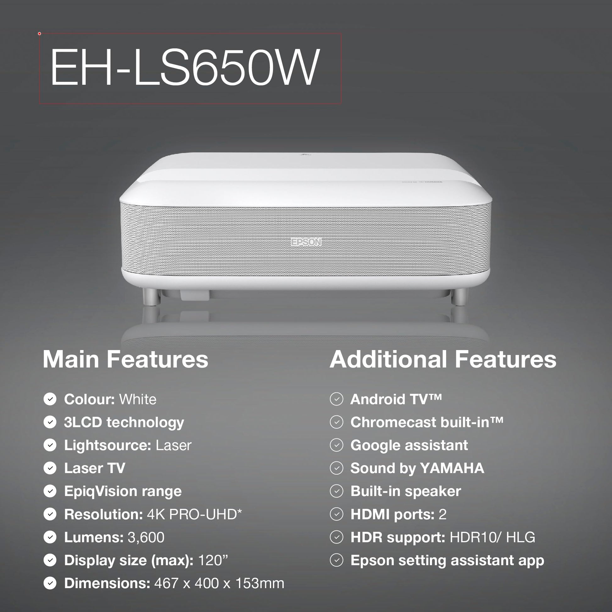 Epson EH-LS650W 4K Ultra Short Throw Projector – 3600 Lumens, Smart TV
