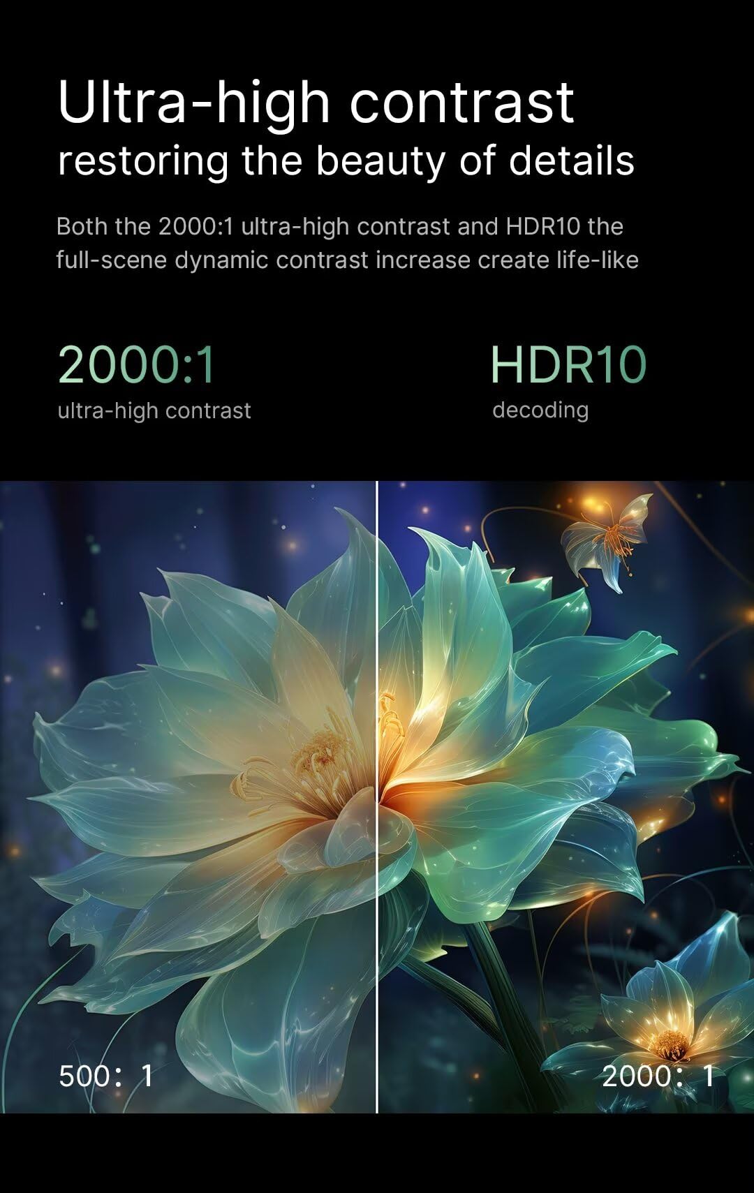 Delivers sharp, vibrant images with native 1080P resolution, 4K decoding support, 300 ANSI lumens brightness, and a 2000:1 contrast ratio for immersive visuals even in low-light settings. -