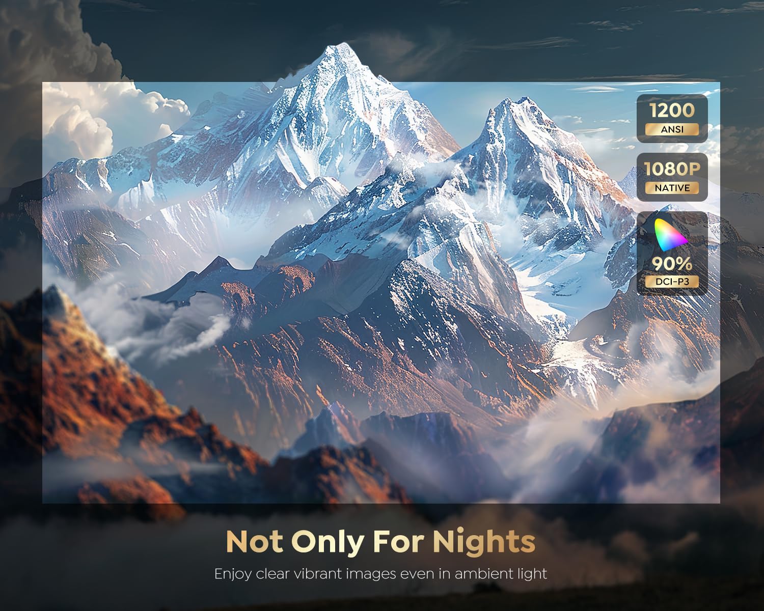 Bright & Crisp 1080P Visuals with 4K Support: Native 1080P resolution with 1300 ANSI lumens (36,000 Lumen-equivalent) delivers vibrant, detailed images even in ambient light. HDR10 and precision glass lenses maximize color depth and clarity for indoor and outdoor viewing.