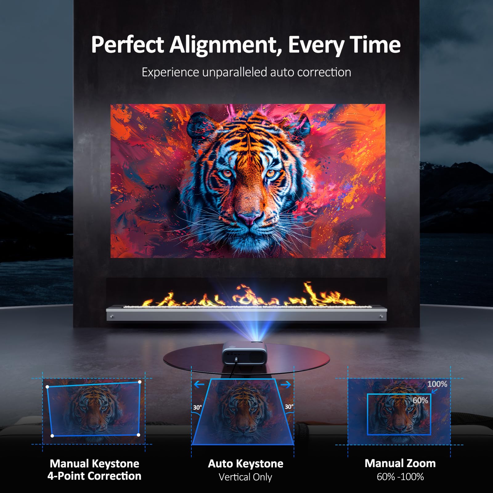Flexible Screen Size: 50–100% zoom allows projection up to 300 inches, creating a large cinematic experience without moving the projector.