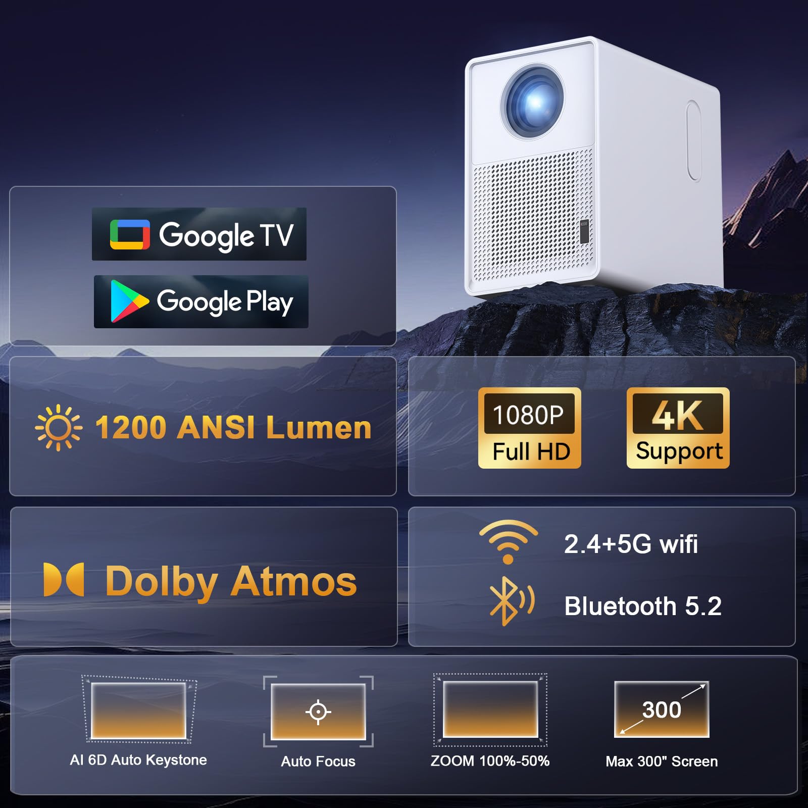 QIAOLET C800 Smart Projector | 1080P Native, 4K Supported, 1200 ANSI, Google TV, Auto Focus & 6D Correction, WiFi 6 & Bluetooth 5.2, Home Cinema