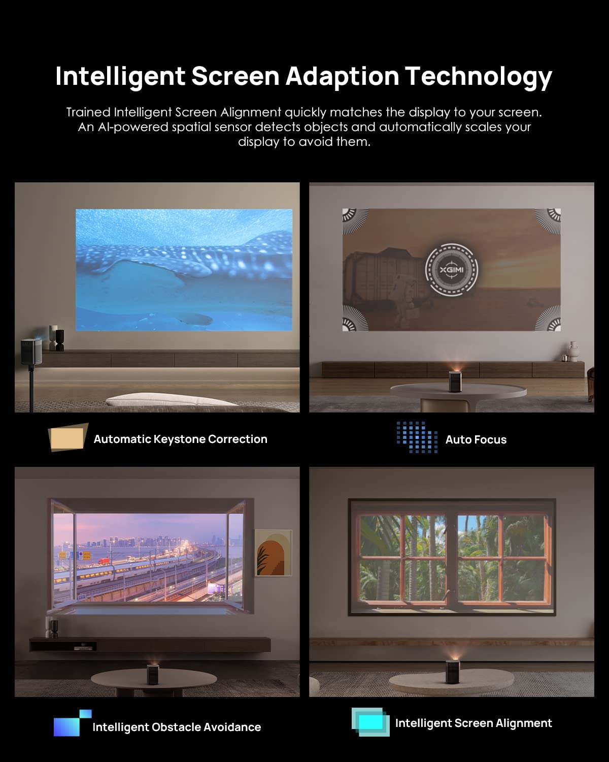Intelligent Screen Adaptation: Auto Keystone Correction, AI Object Avoidance, Auto Focus, and Intelligent Screen Alignment simplify setup, ensuring perfectly aligned images in seconds.